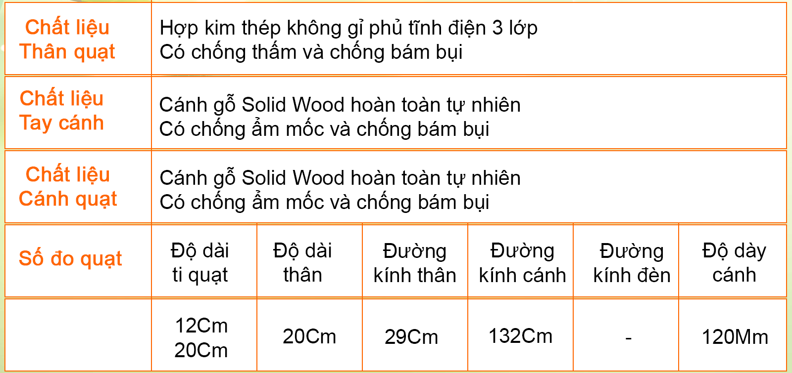 Cánh quạt được cắt trực tiếp từ khung gỗ nguyên bản tự nhiên cho độ bền cực kỳ cao. Ngoài ra, được xử lý kỹ thuật về chống mối mọt, cong vênh và chống thấm tuyệt đối giúp góp phần gia tăng sự ổn định khi quay và hoạt động nhẹ nhàng êm ái hơn.