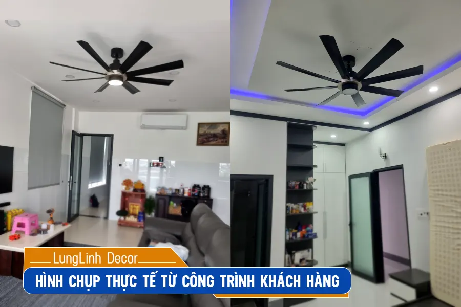 Gợi ý: Mẫu quạt trần này phù hợp lắp cho những ngôi nhà có độ cao trần từ 3m6 tới dưới 6m. Không gian rộng trên 20m2. Phần ti quạt sẽ được kỹ thuật viên điều chỉnh cho cân đối lúc lắp đặt.