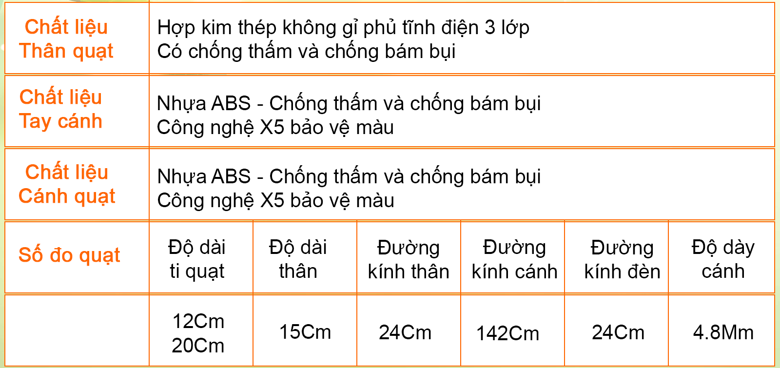Thông tin về chất liệu quạt