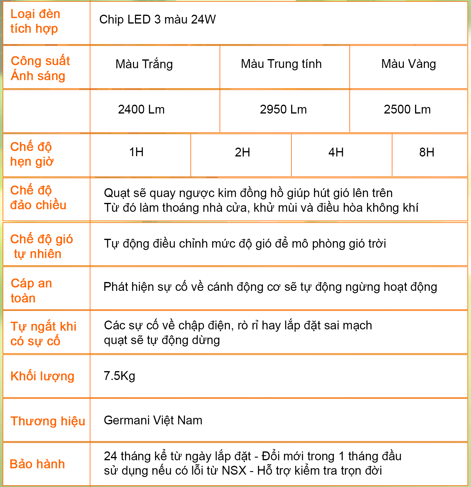 Loại Led tích hợp cho mẫu quạt trần này là Chip Led 24W cùng 3 dải màu: Trắng, Vàng nắng và Vàng ấm. Độ phát quang khá tốt, dài màu êm, dịu mắt, ánh sáng ổn định, đồng đều không nhấp nháy hay mờ sáng, đặc biệt không chứa tia UV đảm bảo sức khỏe cho người sử dụng.