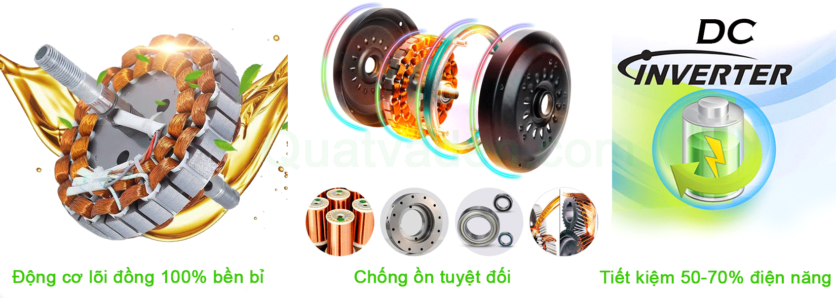 Loại Motor: Động cơ DC Inverter tiết kiệm điện, có độ bền cao, tuổi thọ có thể lên tới 20 năm sử dụng liên tục.