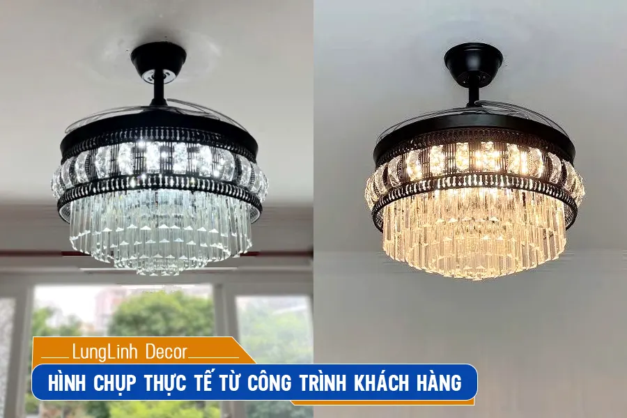 Mẫu quạt sử dụng khung đen kết hợp pha lê cao cấp. Hiệu ứng ánh sáng từ các hạt pha lê phản chiếu giúp không gian trở nên ấn tượng ngay khi bật đèn.